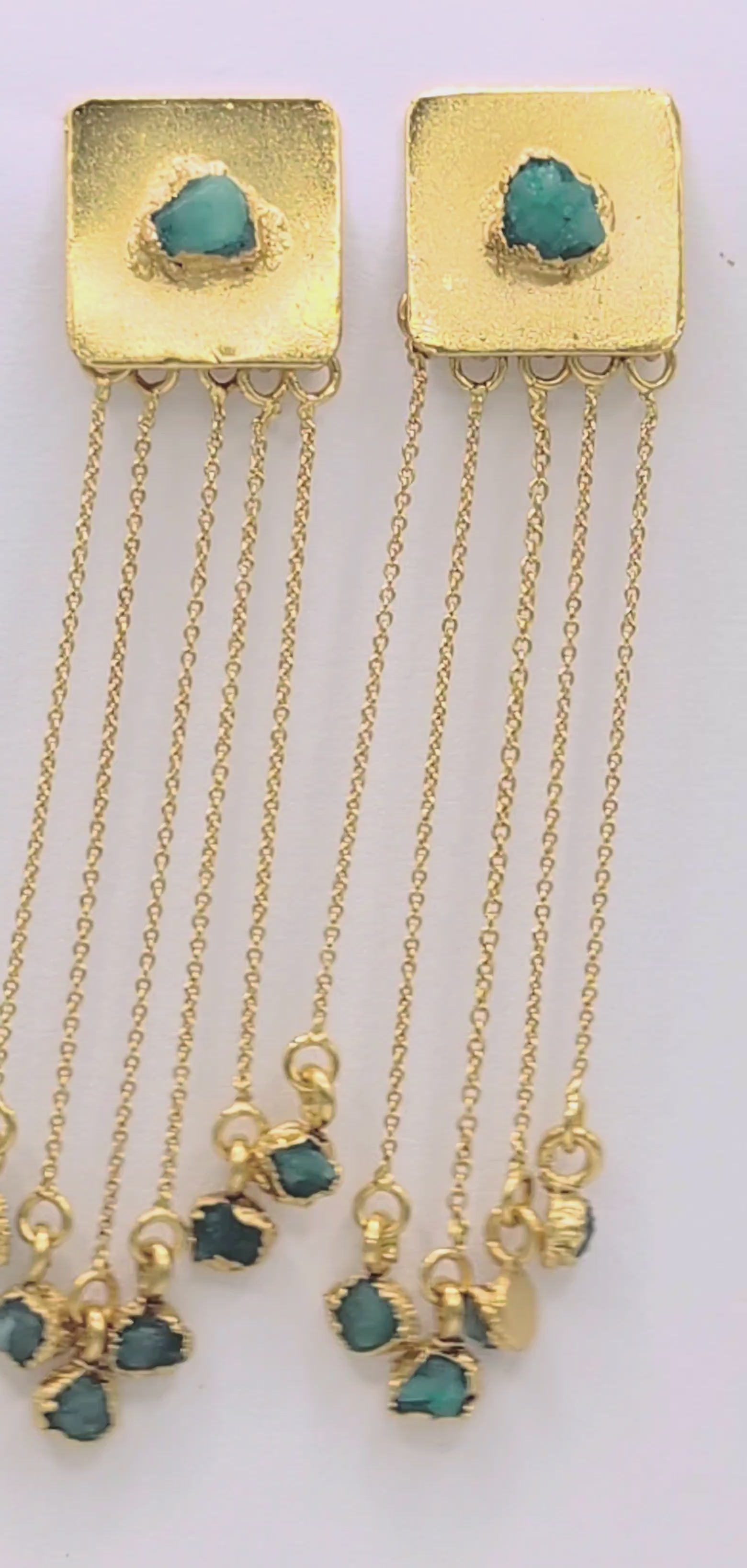 A statement piece from the MDF Alma Signature Collection — bold, rhythmic, and full of movement. Built on the Alma Square silhouette, these earrings feature five delicate chains soldered to the base, each ending in a raw emerald nugget that sways with every step. The textured square holds an emerald at its center — like a pulse, a ritual, a breath of the mountain. The chains dance freely, evoking the fluid motion of skirts, rain, and celebration.