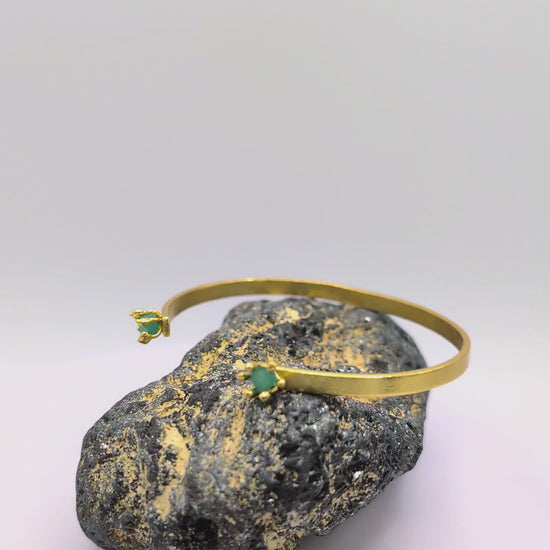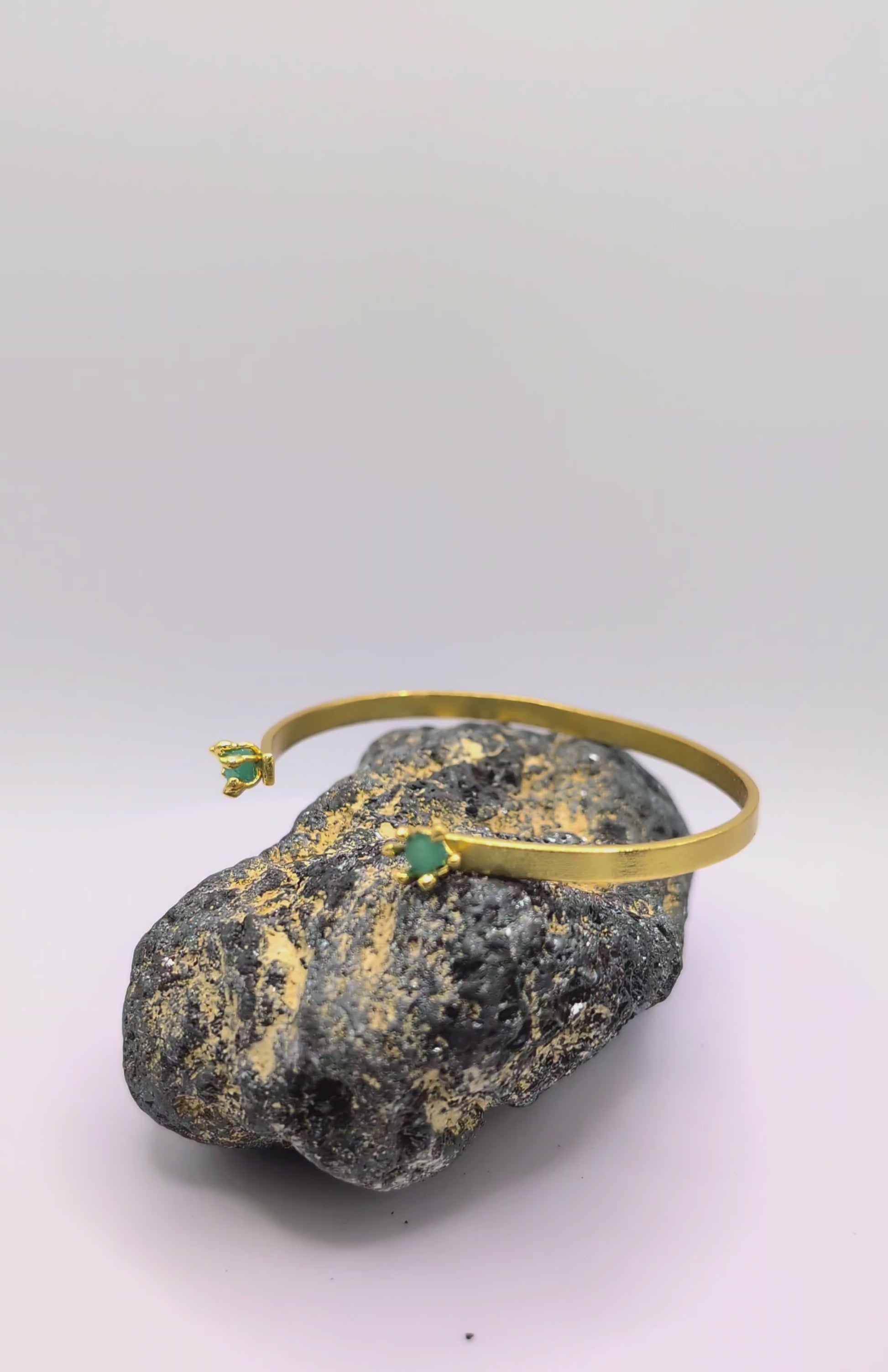 Handcrafted in 24k gold-plated bronze, its minimal and delicate open form is finished with two raw Colombian emeralds, each set in a crown-inspired prong setting that highlights the stone’s natural shape and color. The result is a piece that feels refined yet effortless — a modern statement of quiet strength and femininity.