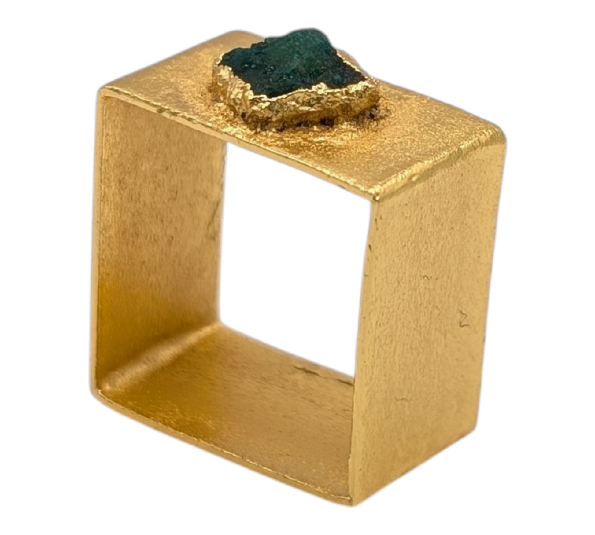 Handcrafted in 24k gold-plated bronze and set with a raw Colombian emerald, its precise form contrasts the organic beauty of the stone.